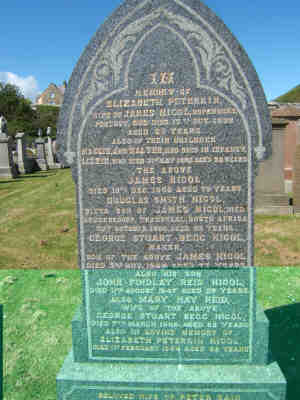 Noted events in her life were: • source. Elizabeth married James Nicol, son of James Nicol and Janet Robb, on 4 Sep 1856 in Backgreen Park, Portsoy, Banffshire Scotland. (James Nicol was born on 24 Mar 1827 in Forglen, Banff, Banffshire Scotland, christened on 14 Apr 1827 in Forglen, Banff, Banffshire Scotland, died on 19 Dec 1906 in Backgreen, Portsoy, Banffshire Scotland and was buried in Portsoy, Banffshire Scotland.) |